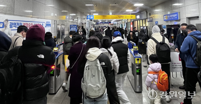 17일 오후 남춘천역. 선물 세트와 캐리어를 든 승객들이 한꺼번에 몰리며 개찰구 앞이 북적였다. 김혁진 역장은 혼잡으로 이동이 지체되거나 안전사고가 발생하지 않도록 개찰구 옆에 서서 승차권을 확인하느라 분주했다. 김 역장은 “명절에는 승차권 환불이나 입석 발매 등 문의가 늘어 역무원들이 가장 바쁜 시기”라며 “가족 단위 승객들은 승차권 종류가 여러 장인 경우가 많아 한 번에 확인해 이동 흐름이 막히지 않도록 돕고 있다”고 말했다.
