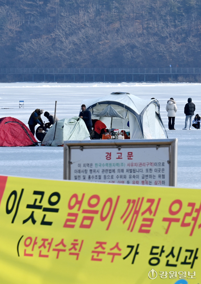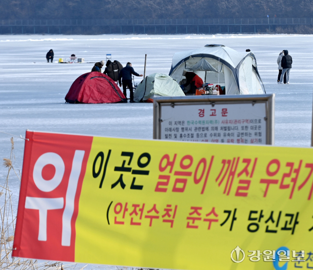 해빙기를 맞아 낮 기온이 영상으로 올라 도내 강과 호수의 얼음 위 수난사고 발생 우려가 커지고 있다. 18일 춘천시 사북면의 춘천호 위에서 관광객들이 얼음낚시를 하고 있다. 임도혁기자