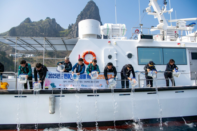 ◇지난해 4월 강원일보 창간 80주년 기념, 한국수자원공단 동해본부 동해생명자원센터와 강원일보가 공동으로 마련한 어린연어 울릉도 해역 방류 모습.