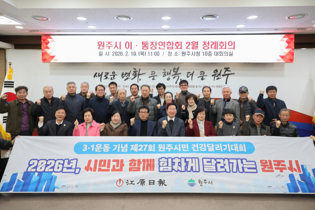 원주시이·통장연합회(회장:강동철)는 19일 원주시청 10층 대회의실에서 원강수 원주시장 등이 참석한 가운데 정례회의와 함께 강원일보 주최 제27회 원주시민 건강달리기 대회 완주와 원주 대도시 특례 확보 및 첨단의료복합산업단지 유치를 위한 화이팅을 외쳤다.