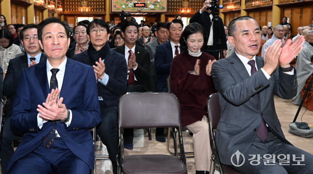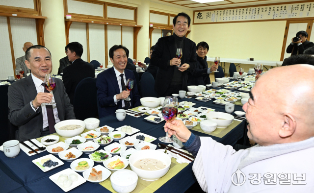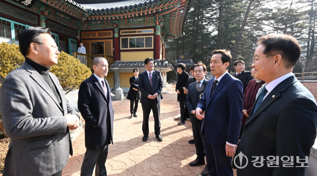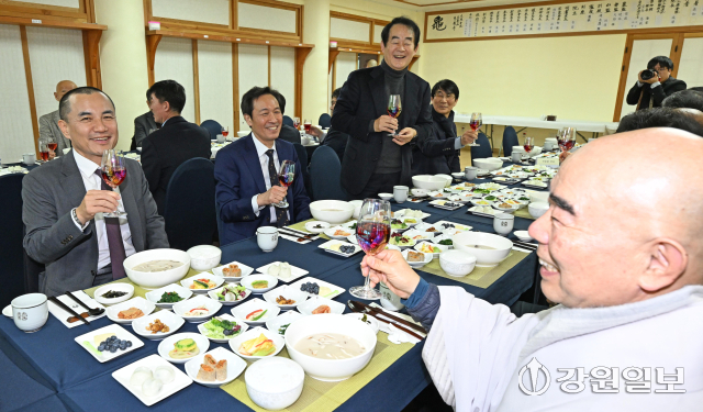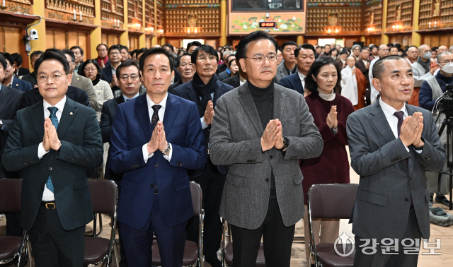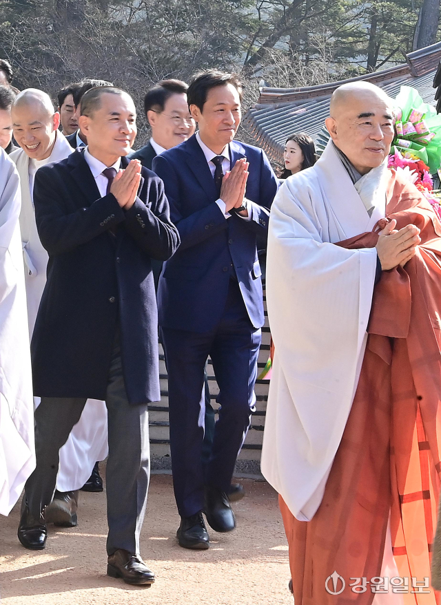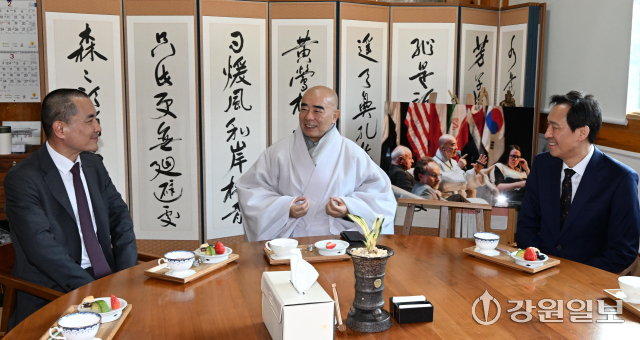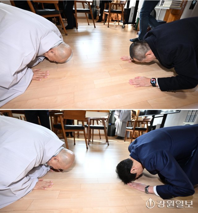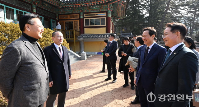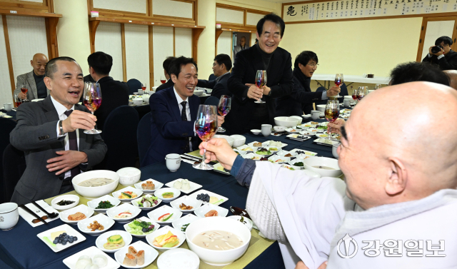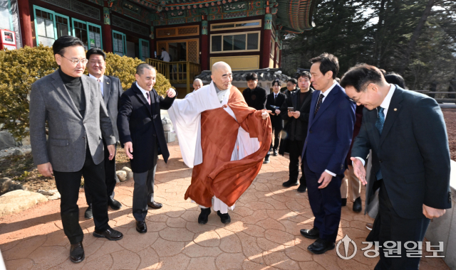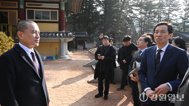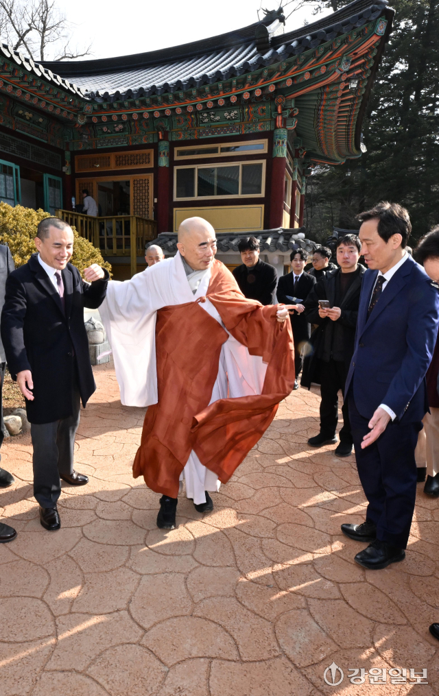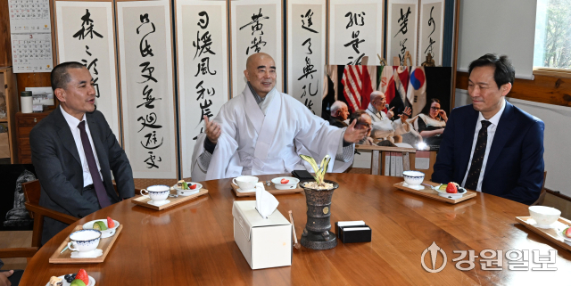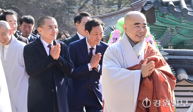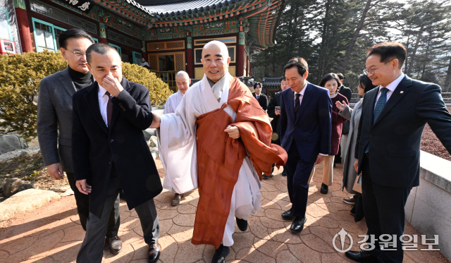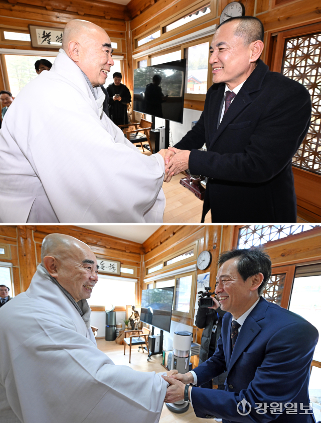 6·3 지방선거 강원도지사 출마 예정자인 김진태 강원도지사와 우상호 전 청와대 정무수석이 21일 평창군 대한불교 조계종 제4교구 본사인 평창 오대산 월정사에 열린 신년하례법회에 참석해 퇴우 정념 주지스님과 대화를 하고 있다. 평창=권태명기자