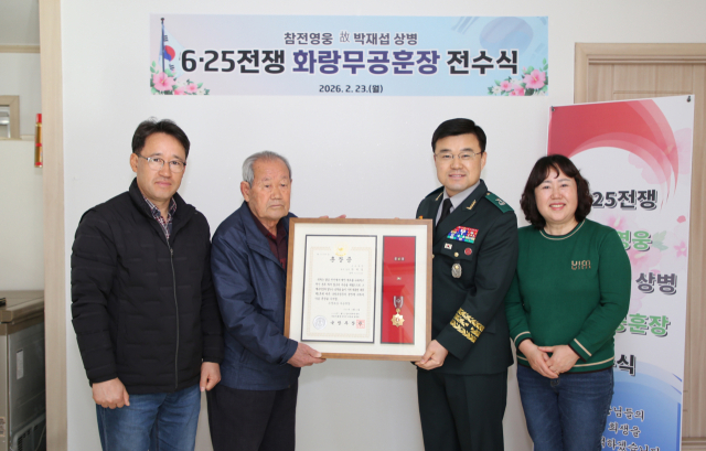육군2군수지원여단은 23일 김민식(준장) 여단장 주관으로 6·25전쟁 격전지였던 강원 금화지구전투에서 전공을 세우고 전사한 춘천 출신 故 박재섭 상병(전사 당시 계급 일병)에 대한 화랑무공훈장 전수식을 열고 훈장을 유가족에게 전달했다. 이날 훈장은 고인의 동생 박재익(86)씨가 대신 받았다.