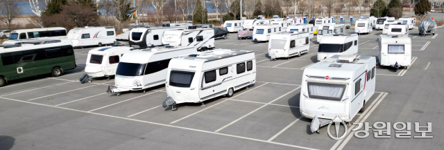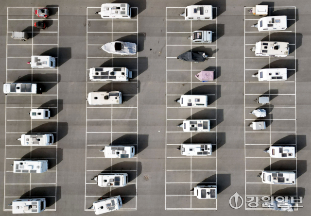 23일 춘천시 삼천동 중도주차장에 무단으로 장기간 주차 중인 카라반과 캠핑카 수십대가 자리를 차지하고 있어 시민들의 불편을 초래하고 있다. 임도혁기자