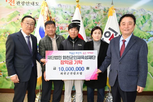 화천군 산림조합(조합장:신준현·사진 맨 왼쪽)은 23일 군청에서 최문순 화천군 인재육성재단 이사장에게 장학금 1,000만원을 기탁했다.