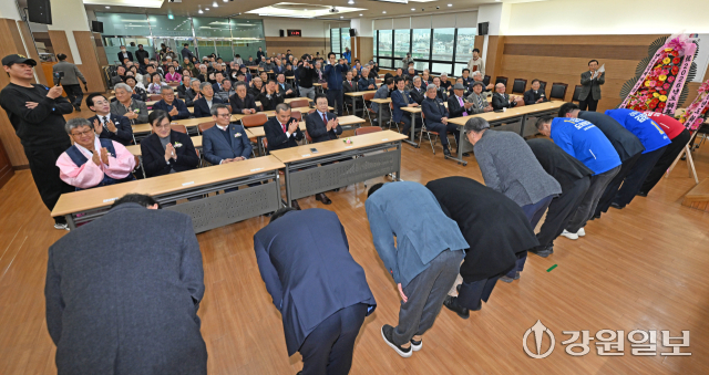 ‘2026 강릉김씨 신년하례회’가 24일 강릉농협 4층 대강당에서 열려 6·3 지방선거 시장 및 시·도의원 출마예정자들이 인사를 하고 있다. 강릉=권태명기자