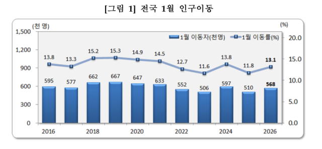 다만 지난해 1월 설 연휴로 이동자 수가 14.6% 급감했던 데 따른 기저효과가 크게 작용한 것으로 보인다. 이동자 수는 장기적인 시계에서 고령화와 인구 감소 등으로 감소 추세이며 단기적으로는 주택 거래량과 입주 예정 아파트 물량 영향을 받는다.