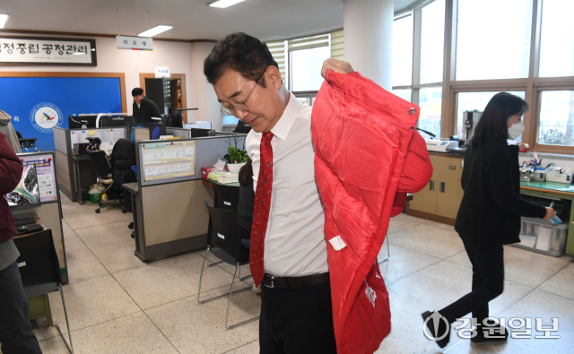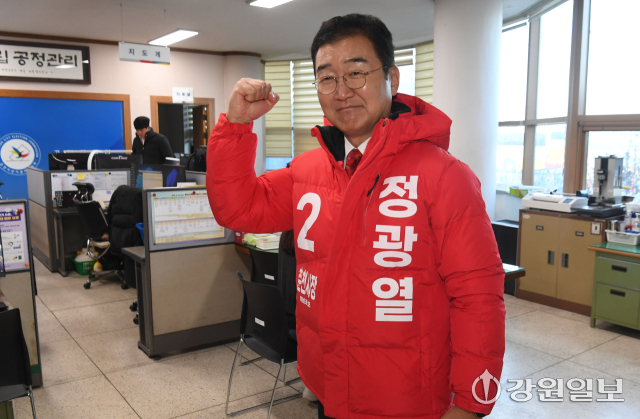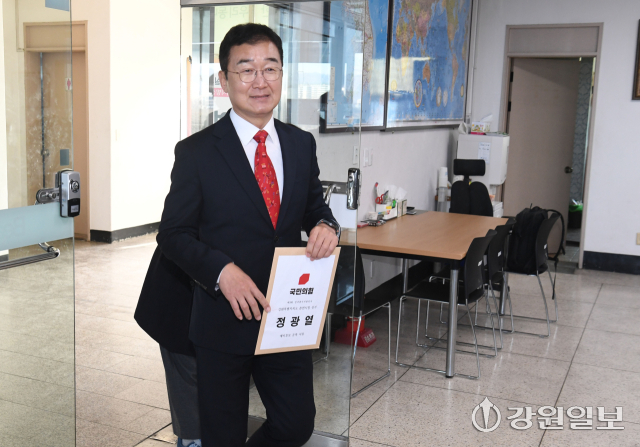 6·3지방선거 춘천시장 선거에 출마하는 국민의힘 정광열 예비후보가 26일 춘천시 선거관리위원회에서 예비후보 등록을 하고 있다.