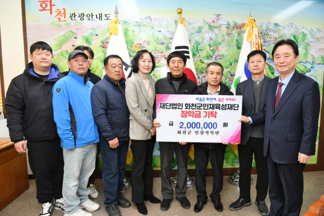 화천군 인삼작목반(회장:김경섭)은 27일 화천군청을 찾아 화천군인재육성재단(이사장:최문순 화천군수)에 장학금 200만원을 기탁했다.