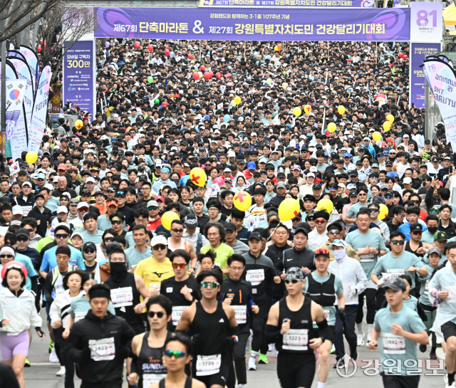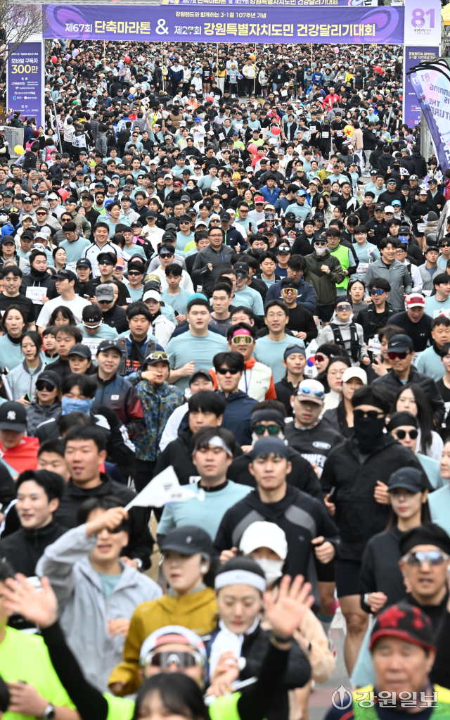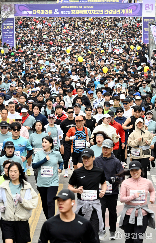 강원일보 창간 81주년과 광복 81주년을 기념하는 ‘강원랜드와 함께하는 2026 3·1절 107주년 기념 제67회 단축마라톤 및 제27회 강원특별자치도민 건강달리기대회’가 1일 도내 18개 시·군에서 일제히 열렸다. 이날 춘천 강원일보사 앞에서 열린 시민건강달리기대회에 참가한 시민들이 힘차게 출발하고 있다. 임도혁기자