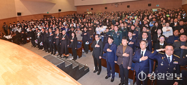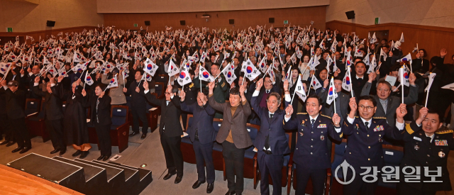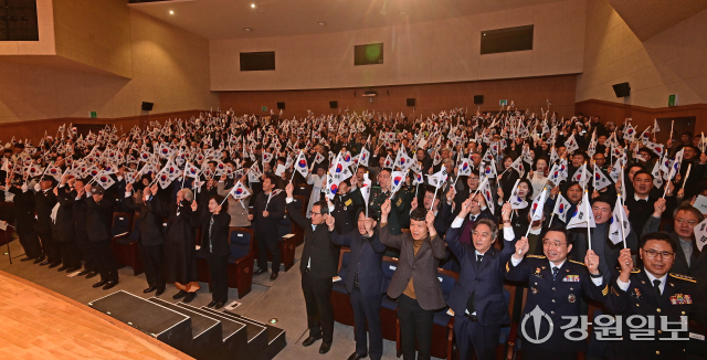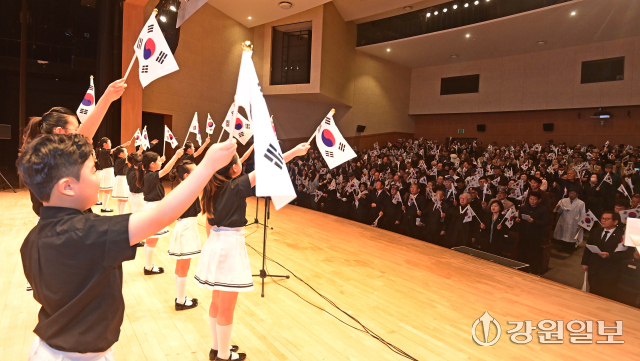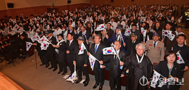 제107주년 강릉시 3·1절 기념식이 1일 강릉아트센터 소공연장에서 김홍규 강릉시장, 최익순 시의장, 최윤정 강원동부보훈지청장, 최진영 광복회 강릉시지부장, 김기현 강릉교육장을 비롯한 독립유공자 유족, 보훈단체 등 관계자들이 참석한 가운데 열렸다. 강릉=권태명기자