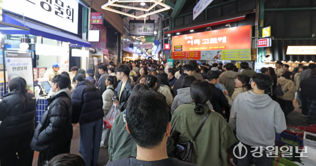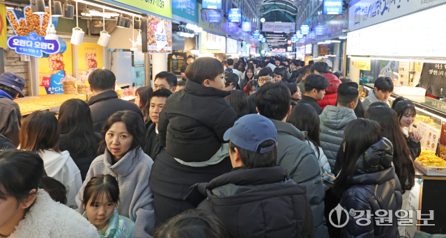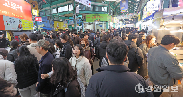 3.1절 연휴 마지막 날인 2일 강릉 중앙시장이 먹거리를 구입하기 위한 관광객들로 발디딜 틈없이 가득차 있다. 강릉=권태명기자