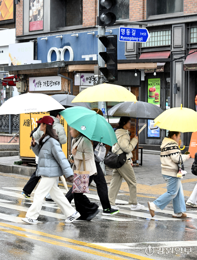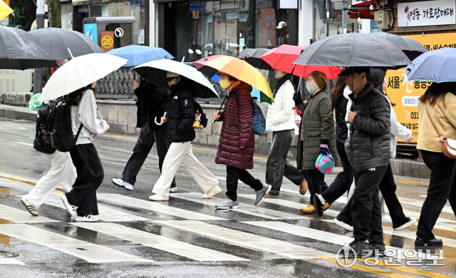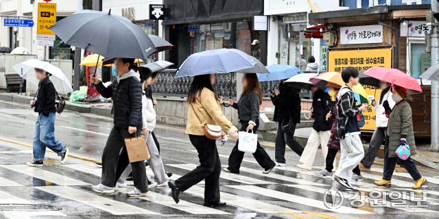 봄비가 내린 2일 춘천 명동거리에서 우산을 쓴 시민들이 횡단보도를 건너고 있다. 임도혁기자
