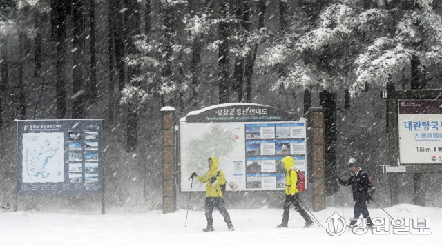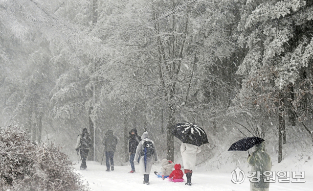 도내 산지와 내륙을 중심으로 폭설이 내린 2일 평창군 대관령면 옛영동고속도로에서 관광객들이 3월 초봄의 설경 속에서 추억을 남기고 있다.