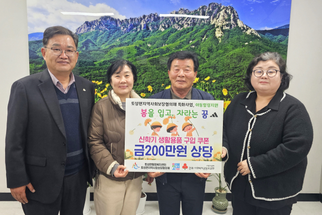 고성 토성면지역사회보장협의체(공공위원장:김석중, 민간위원장:강대헌)는 3일 토성면행정복지센터에서 협의체 특화사업 아동힐링지원 ‘봄을 입고, 자라는 꿈’ 쿠폰을 기탁했다. 협의체는 신학기 생활용품 구입을 위한 200만원(1인당 5만원)의 쿠폰을 마련해 지역아동센터 2개소 40명에게 지원했다.