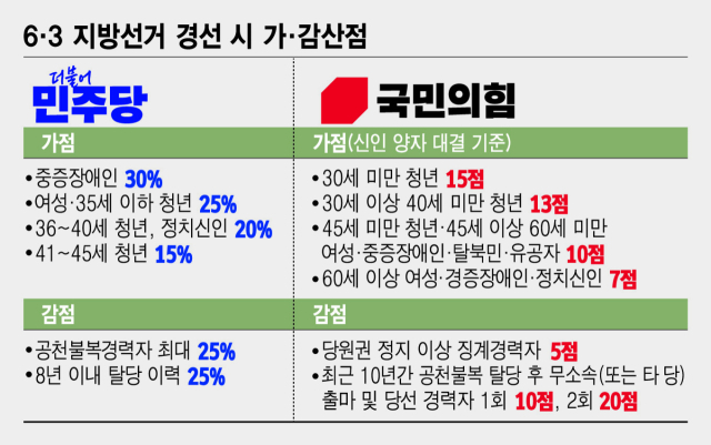 민주당은 이번 지선 경선에서 중증장애인 30%, 여성·만 35세 이하 청년 25%, 36~40세 청년·정치신인 20%, 41~45세 청년 15%의 가산점을 준다. 반면 공천 불복 경력자는 최대 25%까지, 8년 이내 탈당 이력이 있을 경우 25% 감점을 받게 된다.