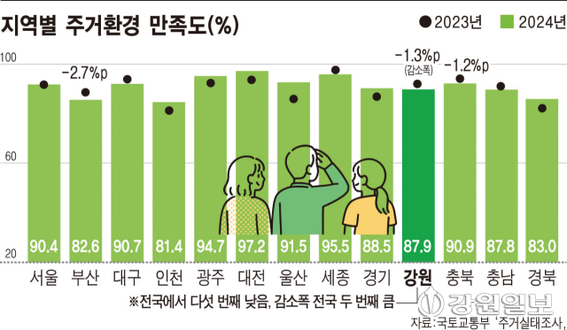 국가데이터처가 5일 발간한 ‘국민 삶의 질 2025’ 보고서에 따르면 2024년 기준 도내 주거환경 만족도는 87.9%로 전국 17개 시·도 중 하위권을 기록했다. 감소폭은 부산(-2.7%p) 다음으로 가장 낮은 1.3%포인트였다.