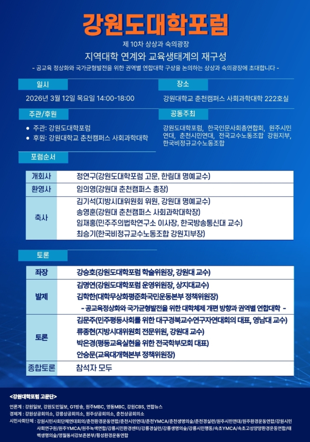강원도대학포럼(운영위원장:김명연 상지대 교수)이 12일 오후 2시 강원대 춘천캠퍼스 사회과학대학에서 ‘지역대학 연계와 교육생태계의 재구성’ 주제로 제 10차 상상과 숙의 광장을 개최한다. 이번 포럼은 지방 교육생태계의 재구성을 통해 인구 감소 위기와 국가불균형발전의 완화를 모색하기 위한 자리로 마련됐다.