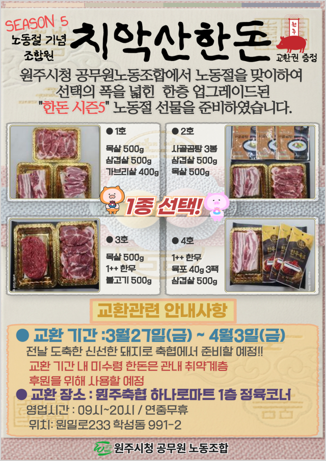 원공노 조합원들은 부서별 대의원으로부터 교환권을 수령, 오는 27일부터 다음달 3일까지 원주축협 하나로마트 1층 정육코너에서 노동절 선물을 교환하면 된다.