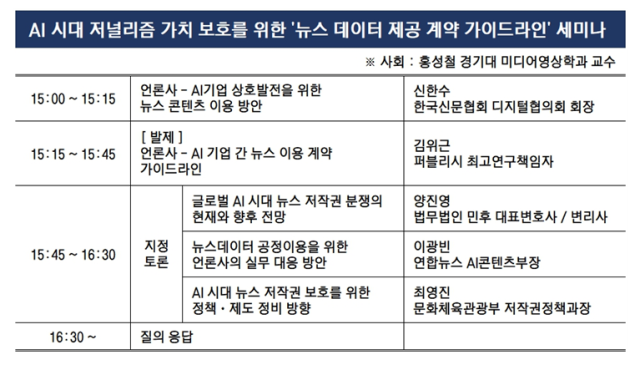 지정토론에서는 양진영 법무법인 민후 대표변호사, 이광빈 연합뉴스 AI콘텐츠부장, 최영진 문화체육관광부 저작권정책과장이 참여해 뉴스 저작권 분쟁 동향과 언론 대응 전략, 제도 개선 방향 등을 논의한다. 사회는 홍성철 경기대 미디어영상학과 교수가 맡는다.