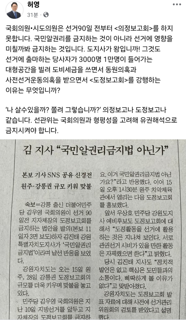허영 의원은 이날 자신의 페이스북에 “국회의원·시도의원은 선거 90일 전부터 의정보고회를 하지 못한다. 국민알권리를 금지하는 것이 아니라 선거에 영향을 미칠까봐 금지하는 것”이라고 적었다.