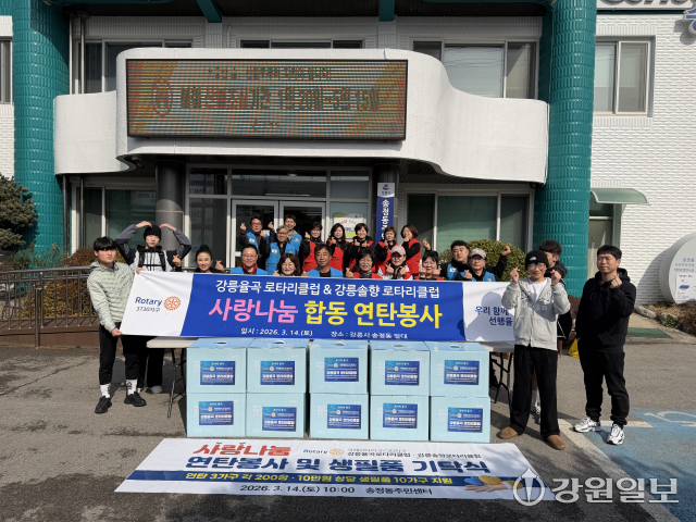 강릉율곡로타리클럽과 솔향로타리클럽은 지난 14일 송정동주민센터에서 취약계층 지원을 위한 ‘연탄 및 생활용품 기탁식을 열고 회원 40여 명과 송정동주민센터 직원들이 함께 참여해 연탄을 직접 배달하며 온정을 나눴다. 이번 지원을 통해 연탄은 취약계층 3가구에 각각 200장씩 전달됐으며, 생활용품은 10가구에 가구당 10만 원 상당으로 지원됐다.