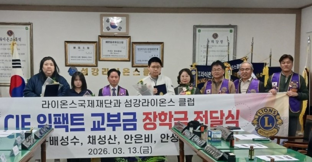◇횡성 섬강MJF라이온스클럽(회장:윤한영)은 지난 13일 클럽사무실에서 횡성지역 중고등학생 4명에게 장학금 200만원을 전달했다.