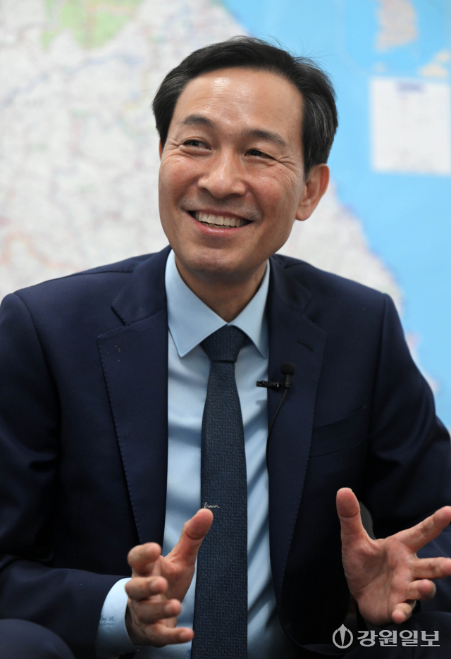 ■우 후보가 그린 강원도 발전 비전은=“첫째, 산업을 일으켜야 한다. 강원도의 가장 큰 문제는 좋은 일자리가 부족하니까 청년들이 떠나는 거다. 해외 유수 기업, 국내 대기업이 투자할 수 있는 여건을 만들겠다. 그걸 할 수 있는 적임자가 나 아닌가 싶다. 지금 밝힐 순 없지만 실제로 몇몇 기업들과 이야기를 진행 중인 것이 있다. 둘째, 18개 시·군마다 잘할 수 있는 걸로 지역 주민에게 혜택이 돌아갈 수 있는 강원도형 산업을 육성하고 싶다. 예를 들면 식품가공, 산림, 어업 등에서 작지만 강한 강원도형 기업을 만들어 수출까지 이어지는 구조를 만들고 싶다. 소위 말하면 ‘수출기업협의체를 만들어서 제가 직접 영업을 같이 뛰어다녀야겠다’는 생각을 갖고 있다. 해외 네트워크는 국회 외통위를 여러번 하면서 구축했고, 상공회의소 등을 활용해 강원도 기업의 수출을 체계적으로 지원할 수 있어야 한다. 개별 기업이 아닌 공공이 나서서 정보를 제공하고 판로를 연결해야 한다. 셋째가 관광이다. 천혜의 자연환경을 가지고 있는데, 밥 먹고 커피 한 잔 하면 더 돈을 쓸 데가 없다. 지금은 말하자면 소규모 자영업을 상대로 한 관광업이다. 이렇게 해선 산업화가 되기 어렵고, 인프라를 잘 구축해서 해외 관광객이 찾을 수 있도록 해야 한다. 그리고 교육, 의료, 교통 3대 분야를 최우선으로 정주 여건을 개선하겠다.”