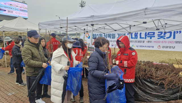 강원일보와 양양군 양양국유림관리소 양양속초산림조합이 공동으로 마련한 2026년 내 나무 갖기 행사(나무 나눠주기)가 18일 오전 양양남대천 둔치 주차장에서 펼쳐졌다.