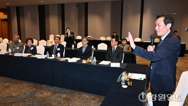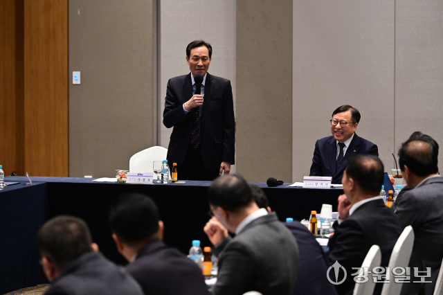 우 후보는 이날 오후 엘리시안 강촌에서 열린 '도지사 후보와 함께하는 정책 제안 간담회'에 참석했다. 우 후보가 등장하자 참석자들은 박수로 맞았고, 우 후보는 일일이 악수하고 명함을 건네며 인사를 나눴다. 도협회는 ‘장애인 일자리 사업’을 비롯해 △강원 고령지체장애인쉼터 설치 △강원교통약자이동편의기술지원센터 운영 △편의증진기술지원센터장 종사자 처우개선 등의 정책을 중심으로 제안에 나섰다.