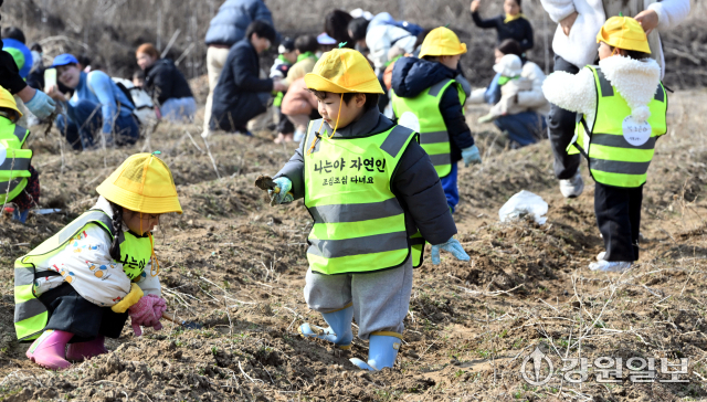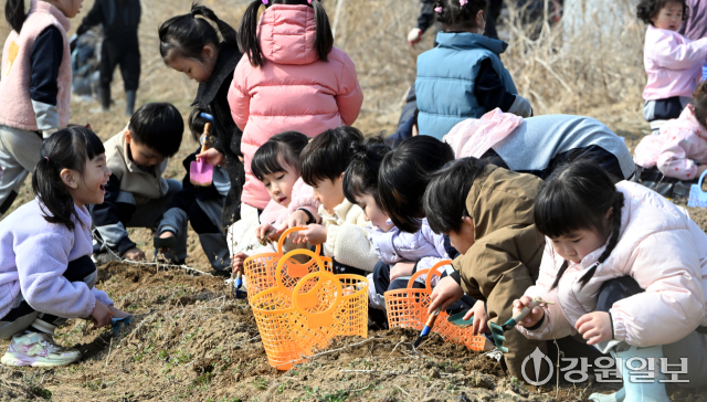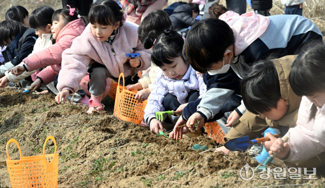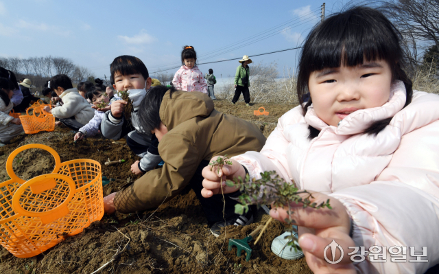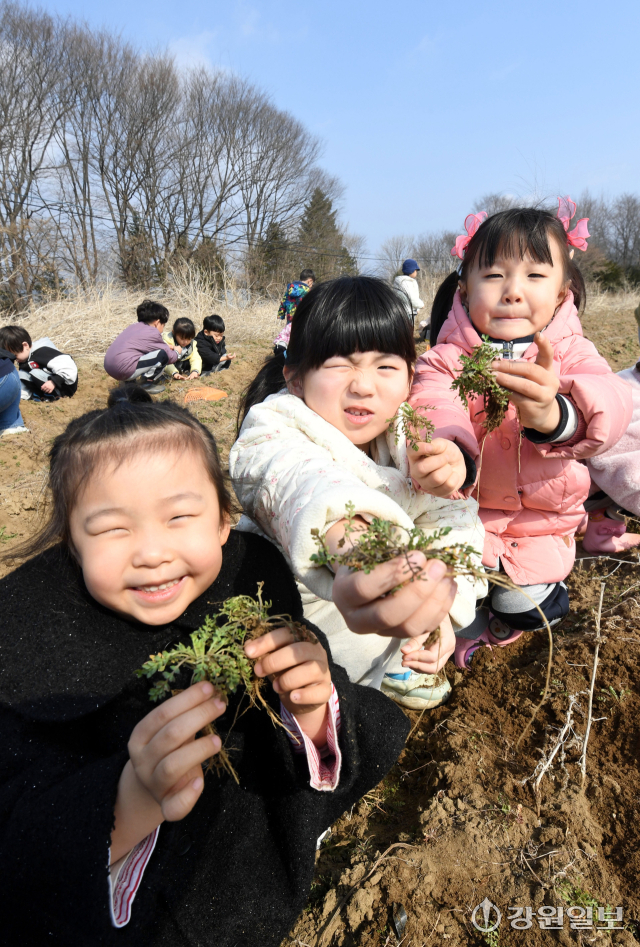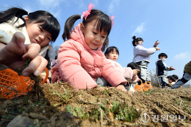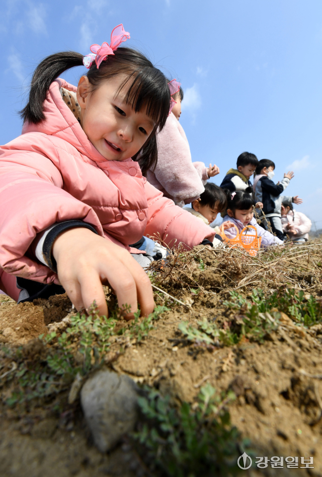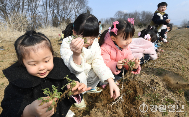 (사)은빛물고기(이사장:반은경)에서 운영하는 봄내꼬마농부연구회가 마련한 '봄내 어린이들의 봄맞이 냉이캐기'행사가 20일 춘천시 상중도에서 춘천지역 13개 영유아 교육기관 원생 및 교사, 학부모 등이 참가한 가운데 열렸다. 행사에 참여한 어린 꼬마 농부들이 노지에서 냉이를 캐고 있다.
