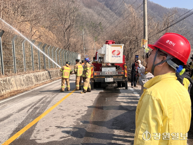 육동한 춘천시장은 지난 21일 남산면 서천리의 한 사유림에서 발생한 산불 현장을 찾아 진화 상황을 점검하고 관계자들을 격려했다. 이날 화재는 오후 1시14분께 발생했고 헬기 7대와 장비 20여 대, 인력 60명이 투입돼 1시간여 만에 진화됐다.