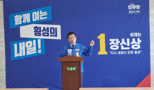 【횡성】오는 6월3일 열리는 전국동시지방선거에 출마하는 더불어민주당 장신상 횡성군수 예비후보가 23일 군청 브리핑룸에서 예비후보 등록 후 첫 회견을 갖고 횡성의 미래 비전을 담은 정책을 발표했다.