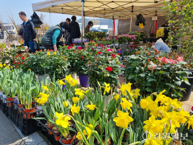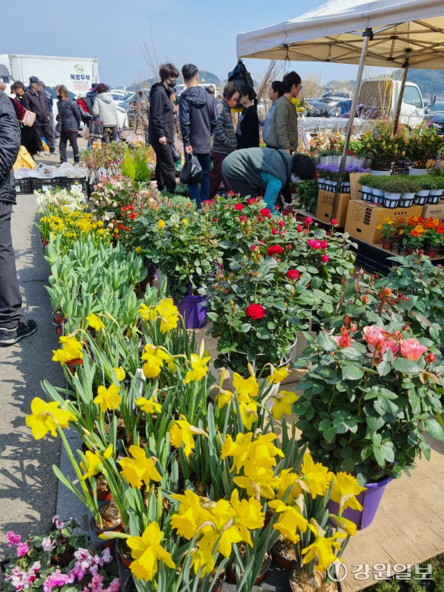 포근한 봄기운이 무르익은 24일 장이 열린 양양시장을 찾은 주민들이 화단을 가꿀 각양 각색의 봄꽃을 고르고 있다