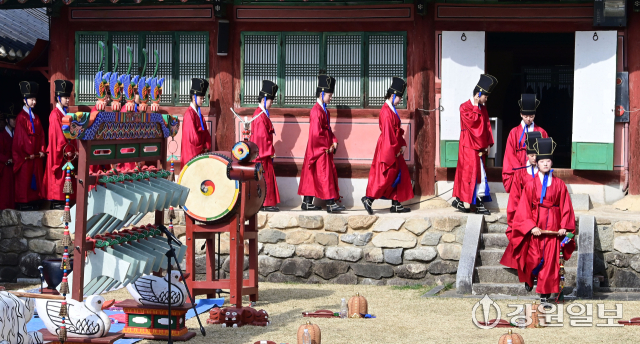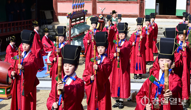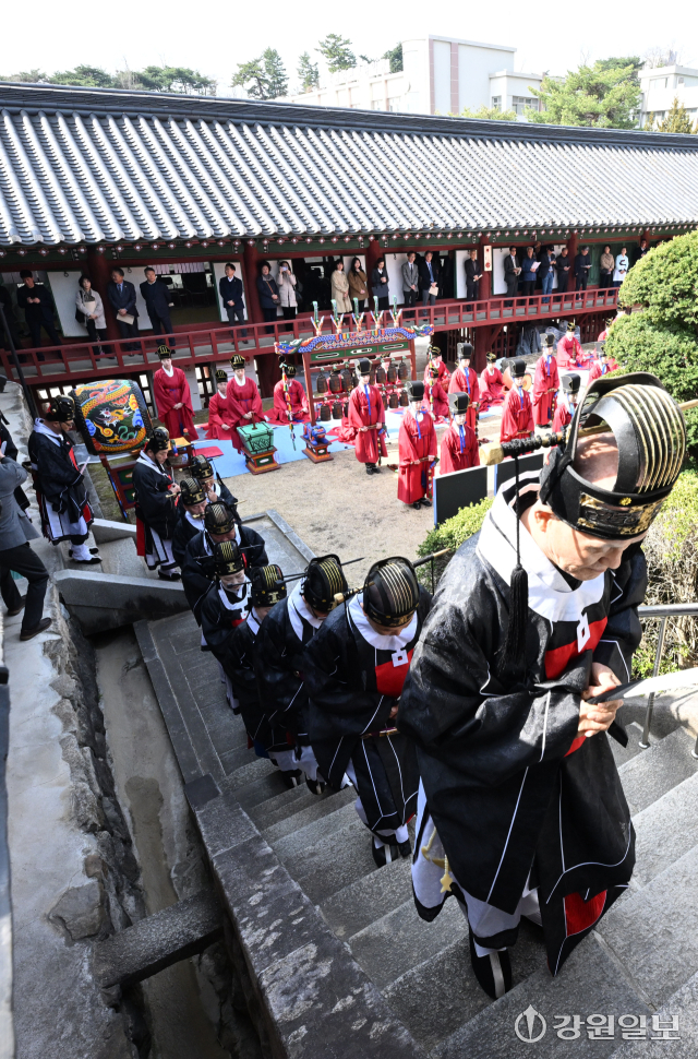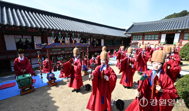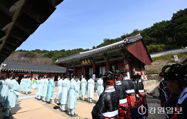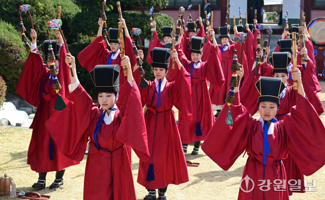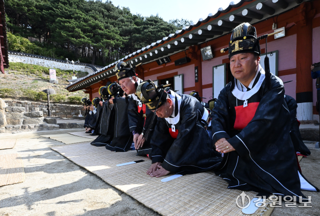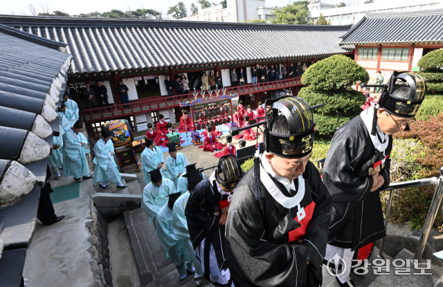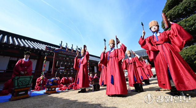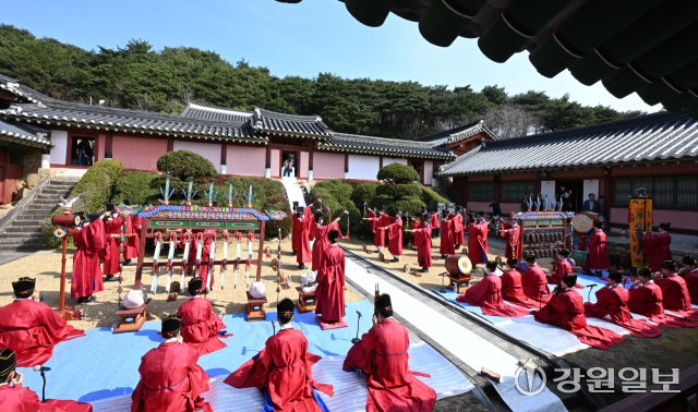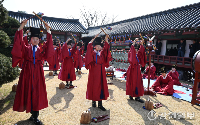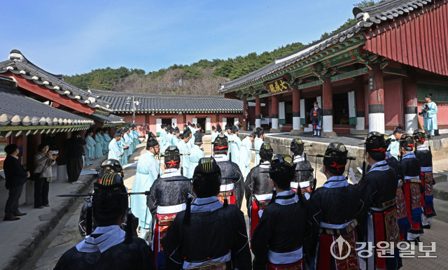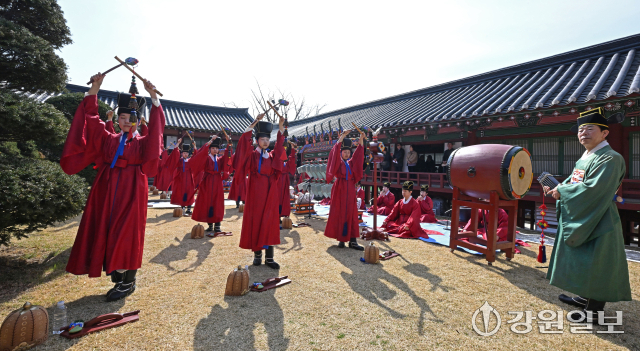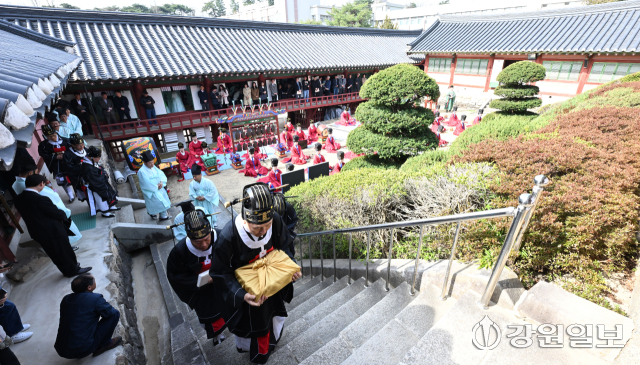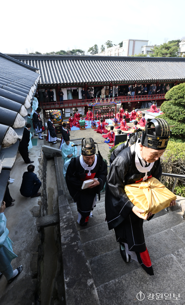 공자를 비롯한 유학 성현들의 학덕을 기리는 ‘2026(공기(孔紀) 2577년) 춘기 석전대제’가 24일 강릉향교 대성전에서 초헌관에 최상은 강릉향교 교육원장을 비롯해 강릉향교 유림과 지역 인사들이 참석한 가운데 봉행됐다. 이날 석전대제에는 문묘제례악 연주와 일무 공연이 함께 펼쳐져 유교 제례의 음악과 춤이 어우러진 전통 예악이 선보여 눈길을 끌었다. 강릉=권태명기자