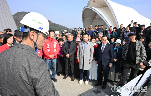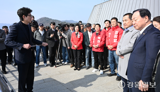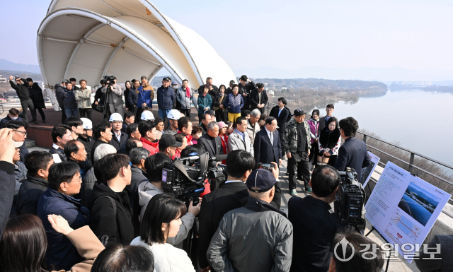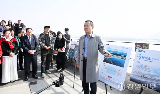 김진태 강원자치도지사와 한기호 국회의원이 24일 춘천시 서면대교 건설공사 예정지를 찾아 기본설계 내용과 향후 추진계획을 마을 주민들과 함께 살펴보고 있다.