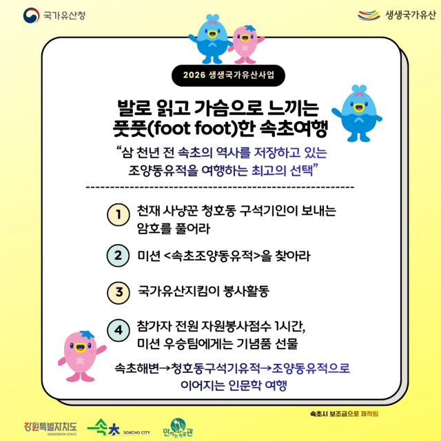 【속초】속초시는 국가유산청 공모사업인 2026년 생생국가유산사업의 하나로 추진하는 도보형 인문학 체험 프로그램 ‘발로 읽고 가슴으로 느끼는 풋풋(foot foot)한 속초여행’ 참가자를 27일부터 사전 모집한다.