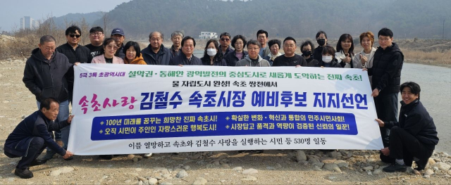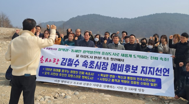 속초시민 530명은 26일 속초시의 식수원인 쌍천에서 6·3지방선거에 출마하는 더불어민주당 김철수 속초시장 예비후보가 “속초의 민생을 책임지고, 시민이 주인인 행복도시 속초의 미래를 열어갈 적임자”라며 지지를 선언했다.