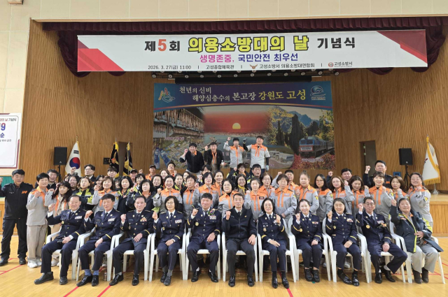고성소방서(서장:김진문)는 지난 27일 고성종합체육관에서 전철수 고성군수 권한대행과 용광열 고성군의장, 김용복 강원특별자치도의회 부의장, 이지영 강원특별자치도의원, 김진문 고성소방서장, 장희조 의용소방대 남성 연합회장, 박혜정 의용소방대 여성 연합회장 등이 참석한 가운데 제5주년 의용소방대의 날 기념행사를 개최했다.