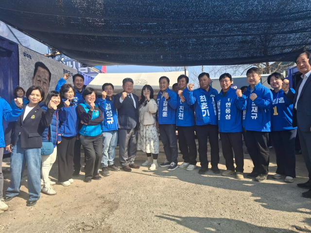 더불어민주당 김세훈 화천군수 예비후보(오른쪽에서 일곱번째)의 선거사무소 개소식이 지난 28일 화천읍 상승로 일원에서 유정배 도당 지역위원장과 화천지역 내 도의원 군의원 출마자, 당관계자와 지지자 등 300여명이 참석한 가운데 열렸다.