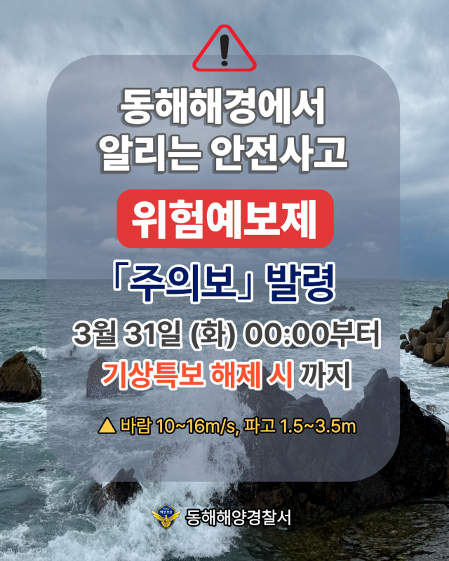 동해해양경찰서(서장:김환경)는 동해중부전해상 풍랑예비특보 발표에 따라 안전사고 위험예보제 ‘주의보’ 단계를 31일 0시부터 기상특보 해제시까지 발령한다.