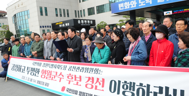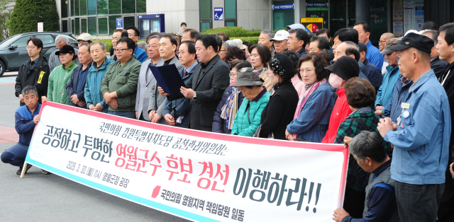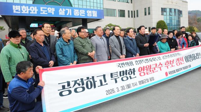 【영월】국민의힘 영월지역 일부 책임당원들은 30일 군청 광장에서 ‘공정하고 투명한 국민의힘 영월군수 후보 경선’을 요구하는 기자회견을 개최했다.