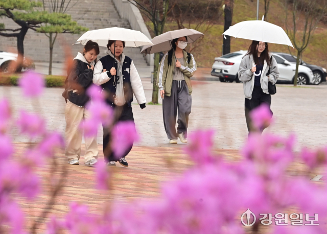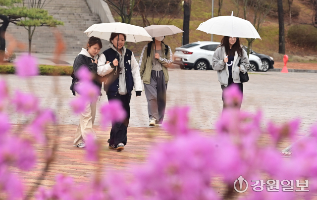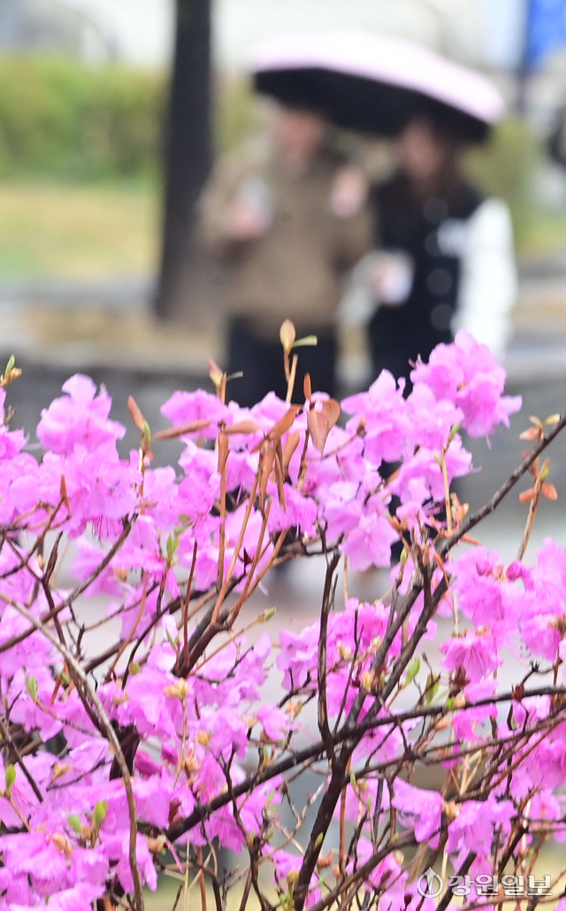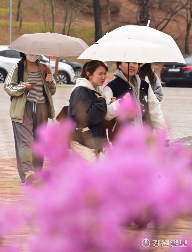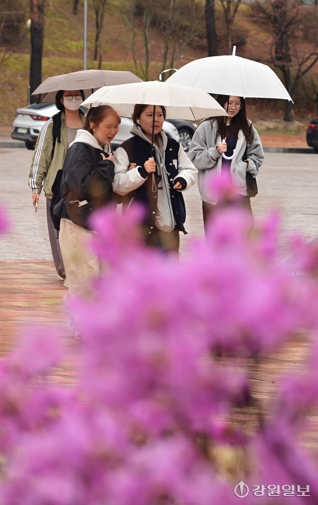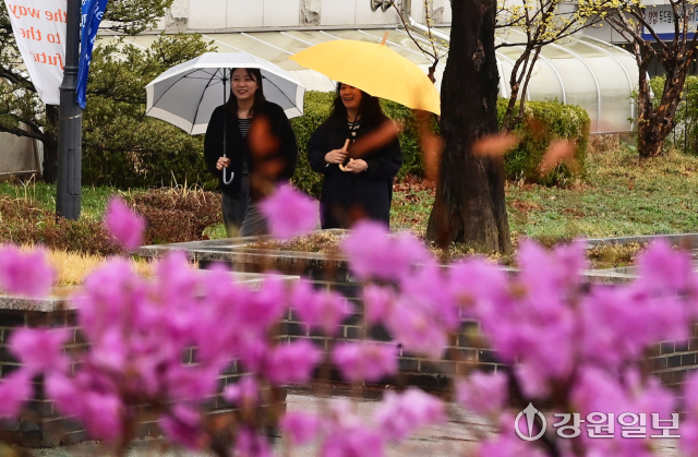 동해안에 비가 내린 지난 31일 강원대 강릉캠퍼스에서 분홍 진달래꽃이 만개한 교정을 학생들이 우산을 쓰고 지나고 있다. 강릉=권태명기자