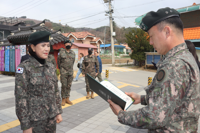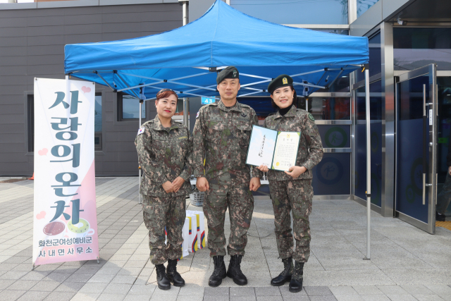 육군 제15보병사단은 1일 화천군 사내면 사내복합체육관에서 열린 신병수료식에서 '사랑의 온차' 활동을 통해 장병과 가족을 꾸준히 환대해 온 사내면여성예비군(소대장:서복순·사진 왼쪽)에 감사장을 수여했다.