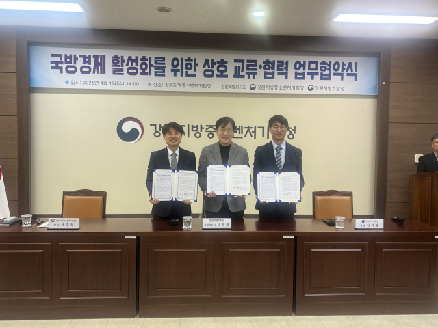 강원특별자치도와 강원지방중소벤처기업청(청장:서종필), 강원지방조달청(청장:강구형)이 1일 중기청 중회의실에서 ‘국방경제 활성화를 위한 상호 교류·협력 업무 협약’을 체결했다.
