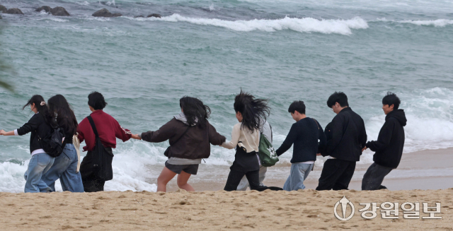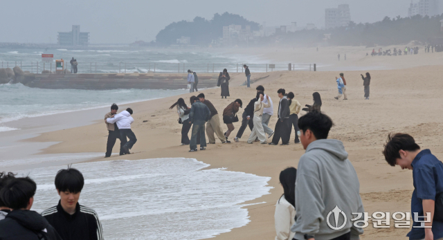 1일 강릉시 강문해변으로 봄소풍을 나온 고교생들이 백사장에서 추억을 남기고 있다. 강릉=권태명기자
