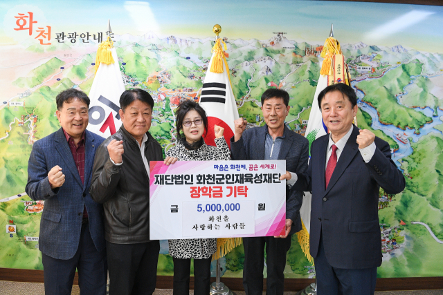 '화천을 사랑하는 사람들'(회장:곽경배) 회원들은 2일 화천군청을 방문해 화천군인재육성재단(이사장:최문순 화천군수·사진 맨 오른쪽)에게 장학금 500만원을 기탁했다.