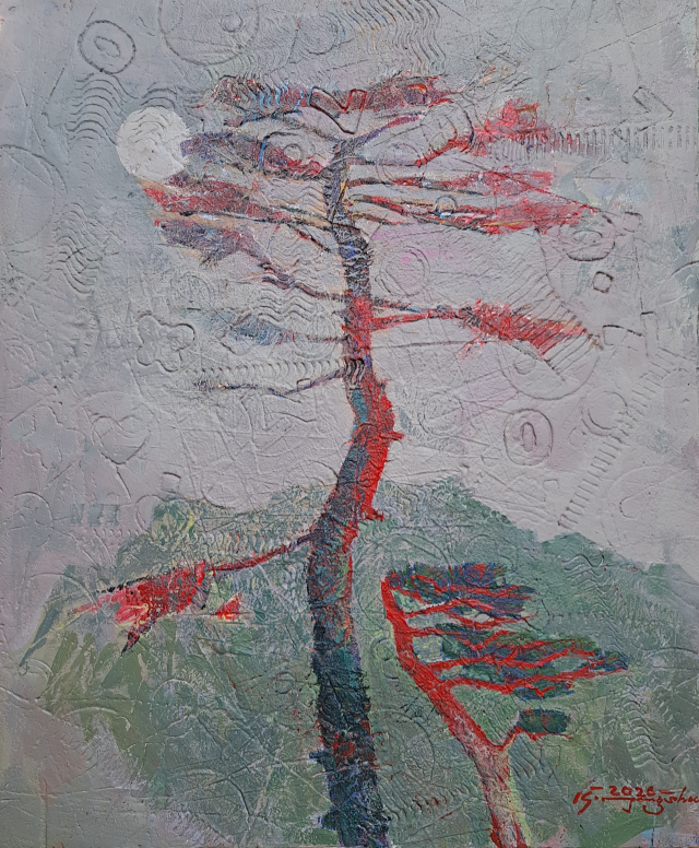 이번 전시의 핵심인 ‘도시나무’ 연작은 삭막한 도시의 회색 벽을 닮은 거친 질감 속에서도 꿋꿋이 뿌리를 내리는 소나무를 통해 현대인의 고독과 강인한 회복력을 은유한다. 특히 돌가루(석분)를 바르고 캔버스를 밭 매듯 긁어내는 작가 특유의 ‘호미질’ 기법은 평창에서 흙을 만지는 일상과 닮아 더욱 정교하고 깊어졌다는 평가를 받는다. 작품 화면 전체를 감싸는 오묘한 미색과 회색의 변주 위에 짙게 형상화된 역동적인 소나무 줄기는 소음 속에서도 묵묵히 제 자리를 지키는 우리 이웃의 모습이자, 낯선 대지 위에서 스스로를 단단히 다져온 작가 자신의 투영이기도 하다.