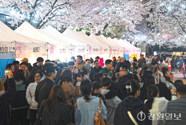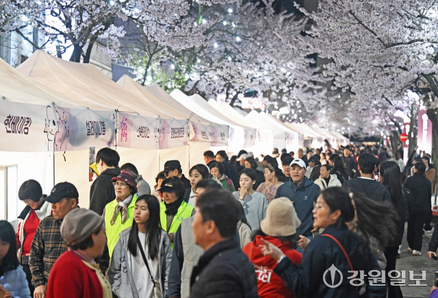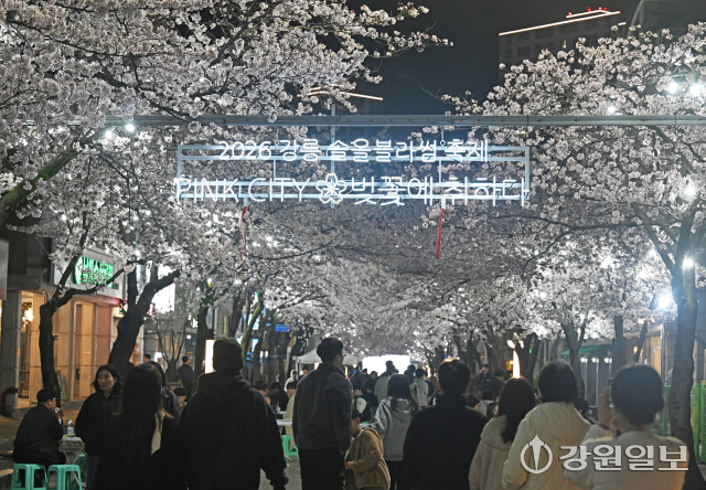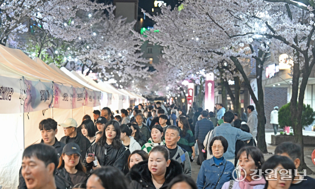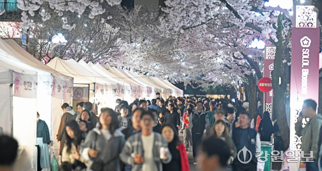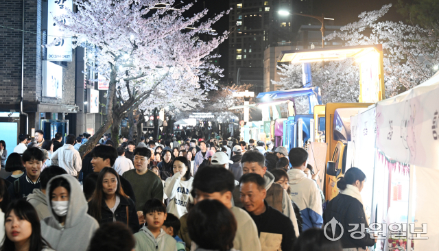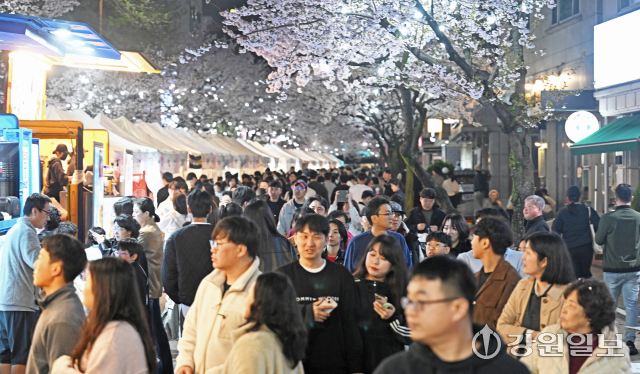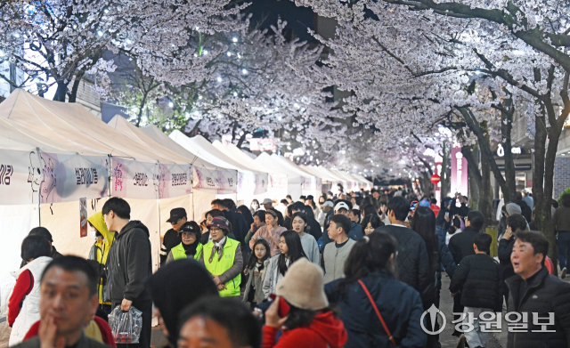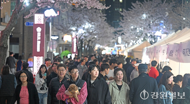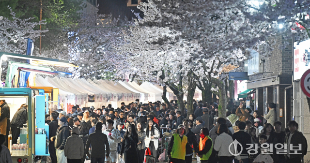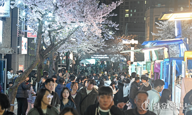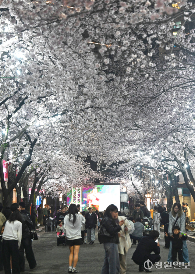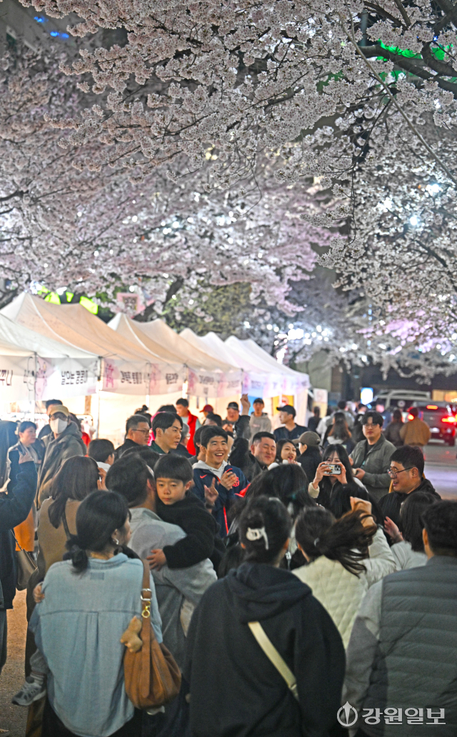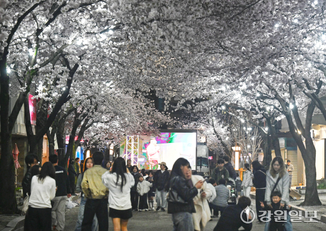 4일 밤 강릉시 교동택지에서 열린 '2026 강릉벚꽃축제'의 하나인 '솔올블라썸'에서 만개한 벚꽃나무 아래 시민 관광객들로 붐비고 있다. 강릉=권태명기자