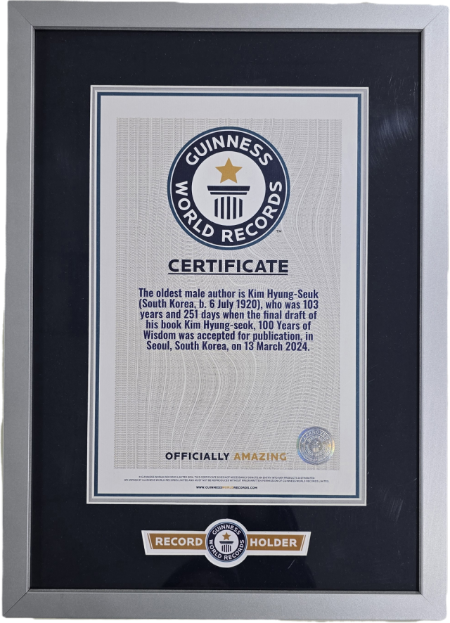 김 교수는 지난 2024년 9월 저서 ‘김형석, 백년의 지혜’를 출간하며 만 103세 251일의 나이로 세계 최고령 저자로 공식 인증받았다. 기네스 세계기록 측은 서류 검증 등 엄격한 절차를 거쳐 해당 기록을 최종 등재했다.