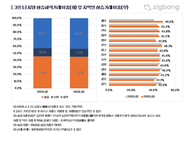 강원지역을 포함한 지방의 상승거래 비중은 지난 2월 45.6%에서 3월 44.9%로 0.7%포인트로 낮아졌다. 하락거래 비중도 42.5%에서 43.4%로 소폭 늘었으나, 수도권(+5.7%)에 비하면 제한적인 수준이었다.
